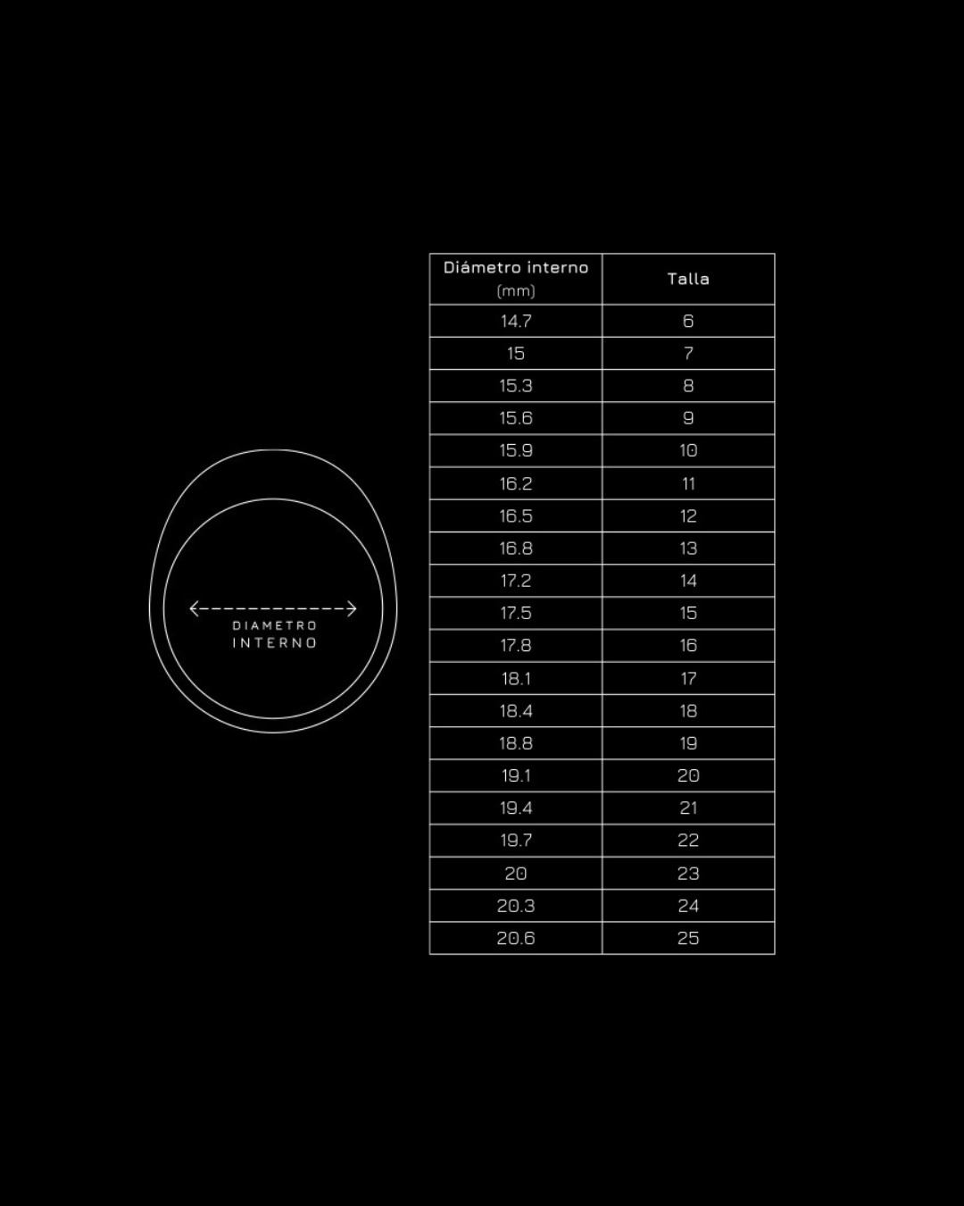 Si no puedes asistir puedes medir tu talla con un anillo que te quede bien de la siguiente manera: colocar anillo sobre una regla bien centrado y medir el diámetro interno en mm. Si buscas un talla que no se muestre en la tabla comunícate vía mail.